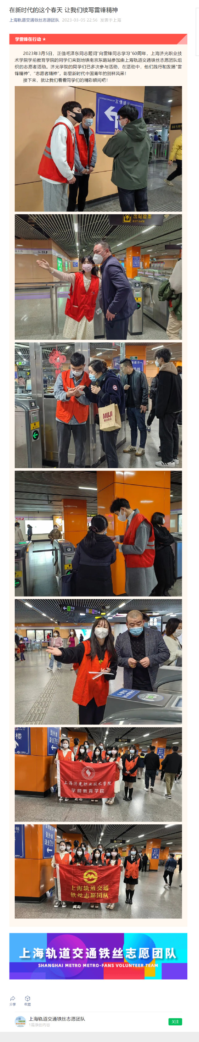 2023年3月5日,上海轨道交通铁丝志愿者官微以《在新时代的这个春天 让我们续写雷锋精神》为题报道了我校学前教育学生在地铁南京东路站参加由上海轨道交通铁丝志愿团队组织的志愿者活动。