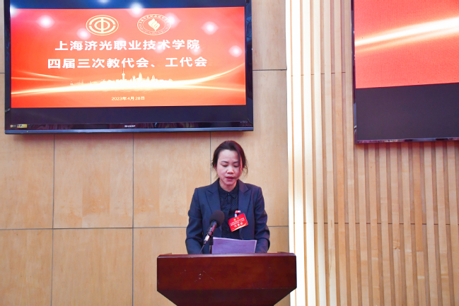 ▲工会副主席黄琪通报了四届二次双代会提案处理和四届三次双代会提案征集情况
