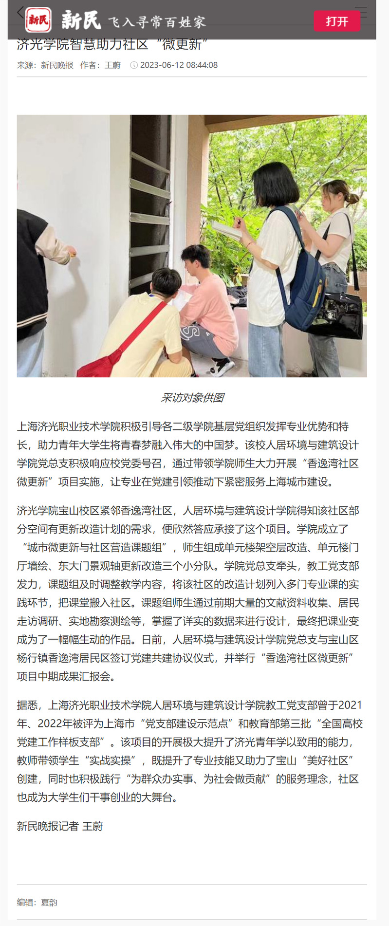 6月12日,新民晚报以《济光学院智慧助力社区“微更新”》专题报道了我校人居环境与建筑设计学院“香逸湾社区微更新”项目。
