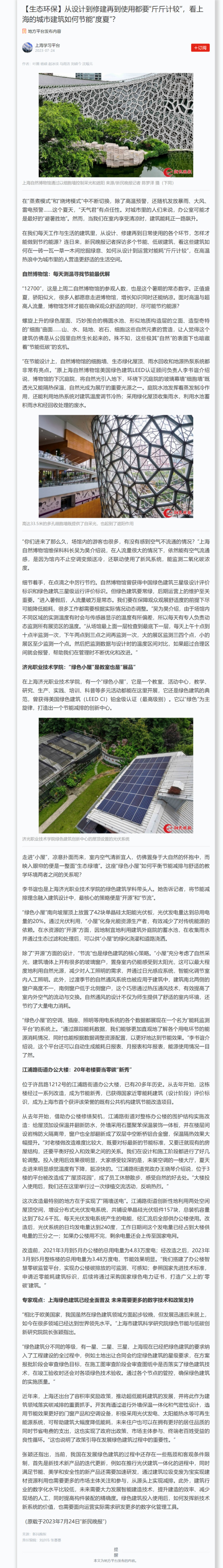 学习强国上海学习平台报道链接:从设计到修建再到使用都要“斤斤计较”,看上海的城市建筑如何节能“度夏”?
