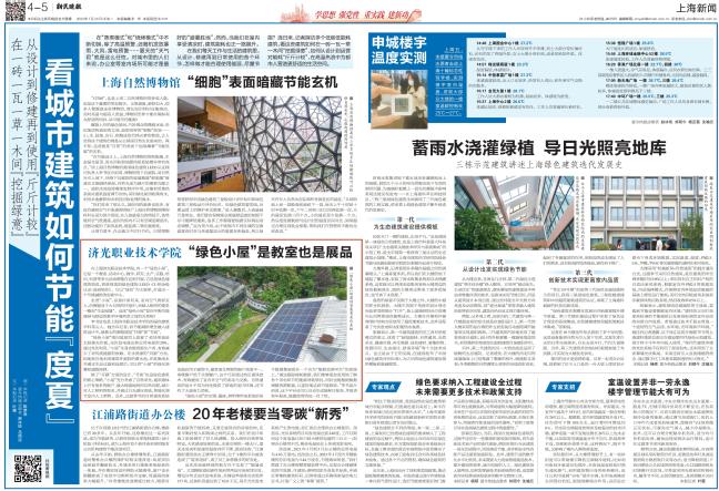 7月24日,《新民晚报》4-5版上海新闻、学习强国上海学习平台《生态环保栏目》以《从设计到修建再到使用都要“斤斤计较”,看上海的城市建筑如何节能“度夏”?》为题报道上海各节能、低碳建筑,并在其中专题报道了我校绿色建筑创新中心。