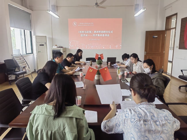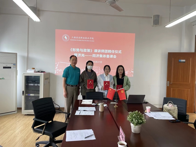 会议伊始,思政部副主任张静对我校思政部《形势与政策》课程近年来的建设做了总结与简要汇报,刘骞副教授就同济大学《形势与政策》课程建设情况和本学期教学要点跟与会教师做了交流。会上,姜富明书记为本学期新加入的三位讲师团成员颁发了聘书,并合影留念。