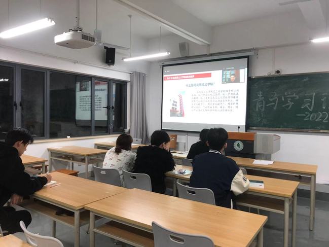 习近平总书记在中国共产党第二十次全国代表大会上的报告中指出“实践告诉我们,中国共产党为什么能,中国特色社会主义为什么好,归根到底是马克思主义行,是中国化时代化的马克思主义行。”11月1日晚,第六期青年马克思主义学习班暨团学骨干培训班第四次集中理论学习讲座在圆形会议室通过线上线下相结合的方式举行,思政部邀请同济大学马克思主义学院教授、博士生导师,毛泽东思想和中国特色社会主义理论体系概论教研室主任,党史学习教育上海市委专家宣讲团成员,上海市习近平新时代中国特色社会主义思想研究中心研究员,上海市马克思主义理论教学研究“中青年拔尖人才”,上海市马克思主义研究会理事吕健教授就这一主题进行理论授课。
