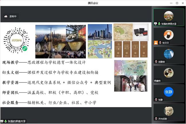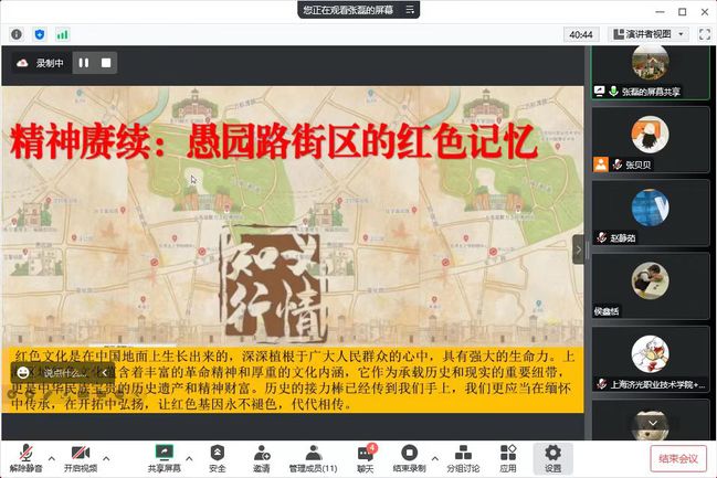 上海市教委中职德育中心组成员、上市教委教研室中职师资培训基地成员、中华职教社社史特聘讲解员、教育部整体规划大中小思政课程项目组成员,曾参与编写教育部《中高职衔接思政课教师教学指南》的张磊老师进行了以《庚续红色精神—职业院校行走党课项目设计与实践》为主题的交流分享。张老师以愚园路街区的红色记忆为主线,分享了职业院校与本科学院资源共促的行走党课设计经验。包括问候开场、介绍点位、提问环节、结尾流程介绍了现场定向任务环节,适用思政课程、课程思政、青马工程、党课等多个领域,形成了三“路”、两“线”、一“江”、一“河”的线路,之后在现场教学、衍生文创、教学资源、师资团队、社会服务等方面,张磊老师均作了非常详细具体的分享。