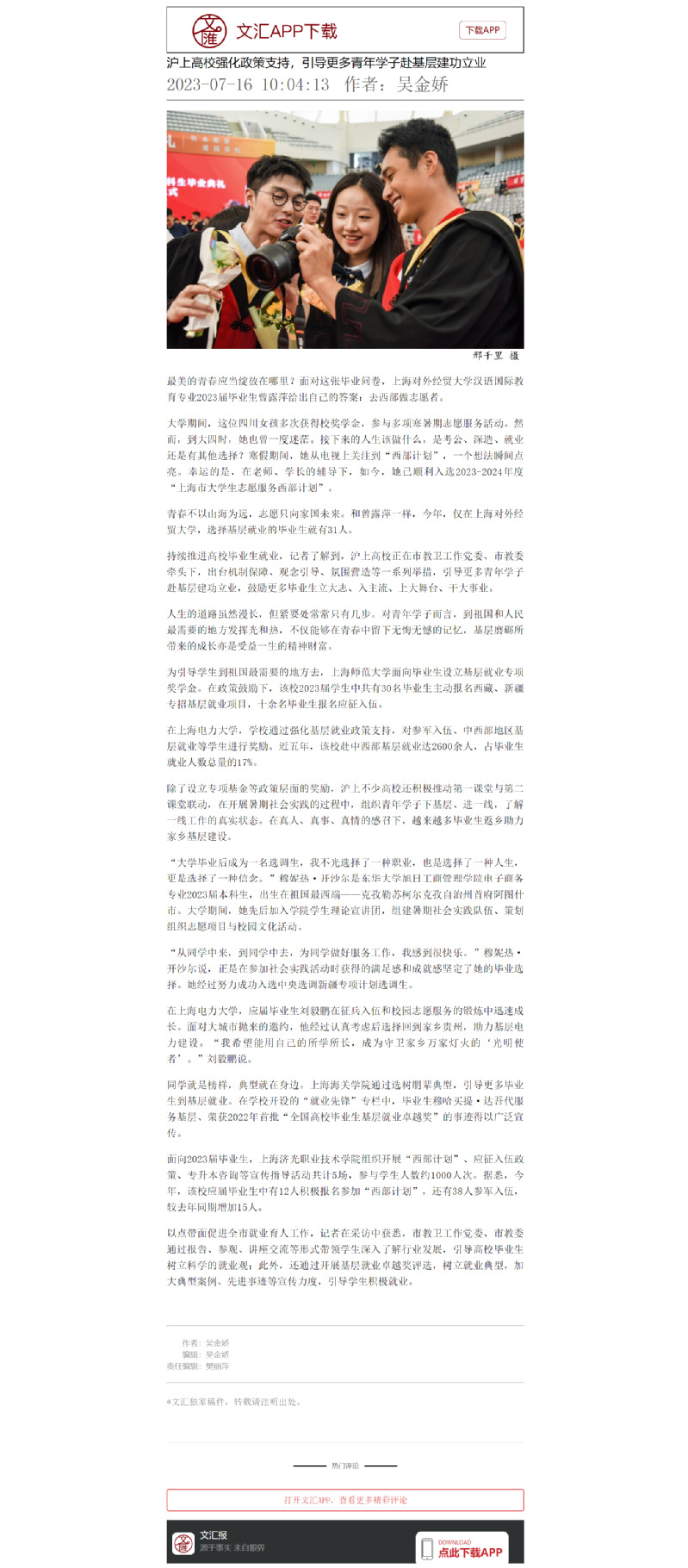 7月16日,《文汇报》以《沪上高校强化政策支持,引导更多青年学子赴基层建功立业》对全市就业育人工作进行了报道,其中对我校就业政策、应征入伍政策、专升本咨询工作进行了报道。