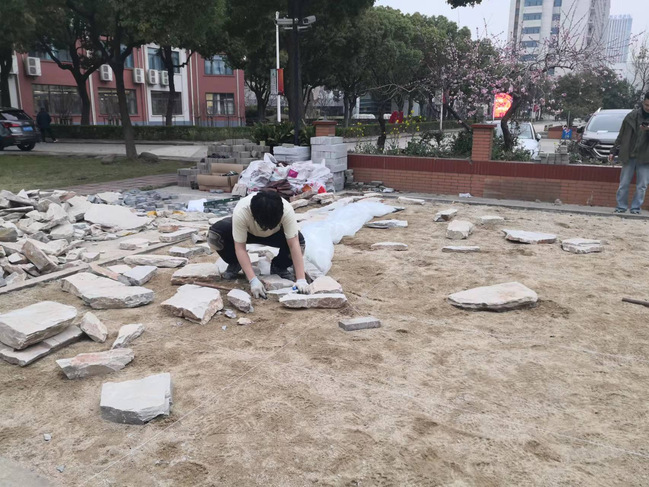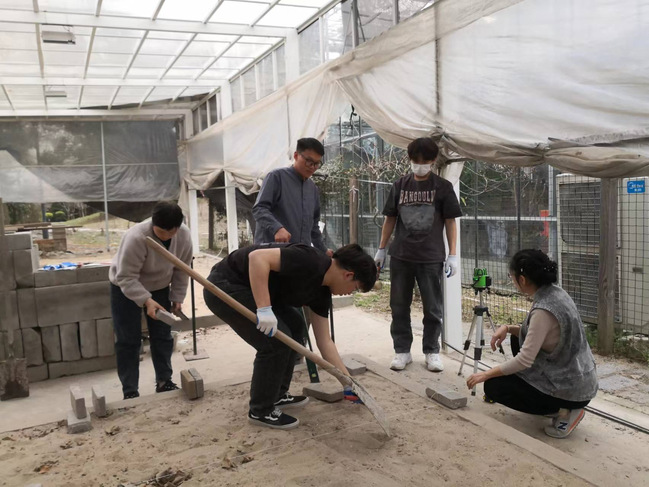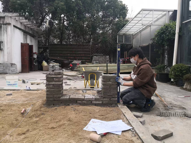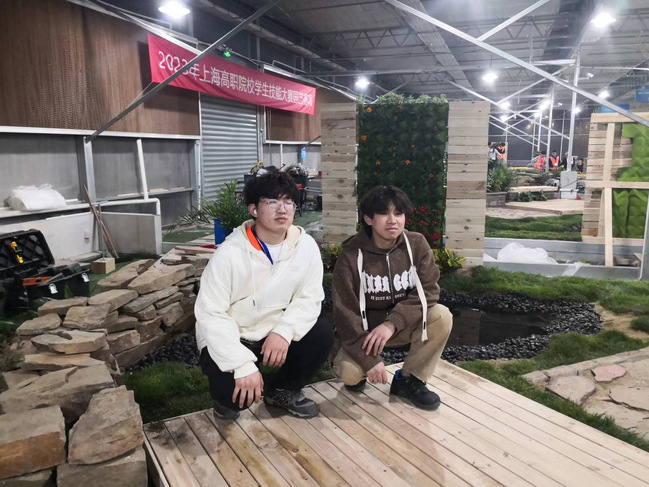 本次“园艺”赛项较往届比赛增加了设计环节,两位选手须在3小时内完成全套施工图纸设计绘制,并在21小时完成场地为49平方米绿地的包括砌筑、铺装、木作、水景、植栽等模块的园艺施工。训练的难度和强度都相当大。园艺比赛对施工精度要求极高,误差仅允许在2毫米内。在毫无施工基础的前提下,两位选手在训练中不仅要学习各项施工工艺和工具机械的使用,还要做到精细施工。“园艺”赛项指导老师拿出课余和全部的周末时间指导选手赛前集训,手把手解决学生绘图中出现的问题。面对学生高强度训练可能出现的各种压力,积极与学生沟通认真倾听学生的想法,解决困惑和问题,让学生们始终保持稳定的精神状态。师生共同制定和调整训练计划,董马钧和杜先响两位团队成员互相配合,在训练中互相激励,取长补短,充分体现了团队合作的重要性。为了抓紧训练时间,两位同学冒雨在场地施工训练,没有喊过一声苦。