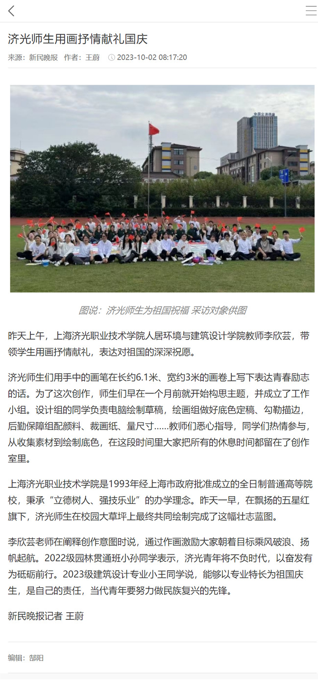 10月2日,《新民晚报》以《济光师生用画抒情献礼国庆》对我校师生共画一幅画献礼国庆活动进行了专题报道。