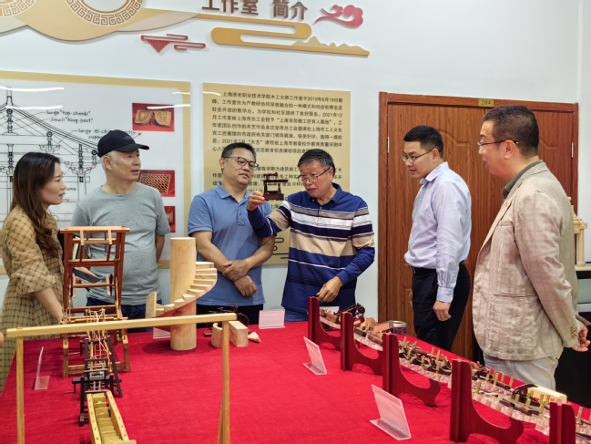会前,张明国副镇长一行在顾惠明大师的介绍下,参观了我校木工大师工作室,与会领导被顾大师及团队创作的一系列微缩榫卯作品吸引,精巧别致的自行车、缝纫机、水车等引来一片片惊叹。