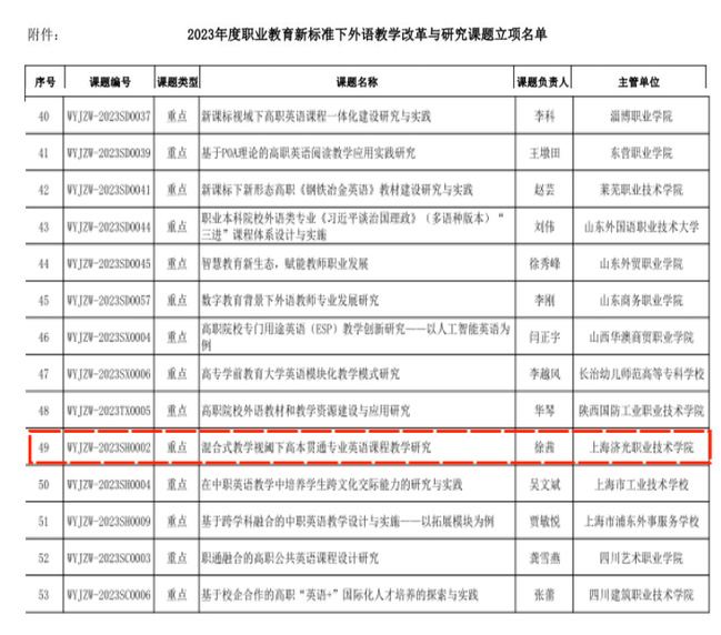 11月1日,教育部职业院校外语类专业教学指导委员会公布了2023年度职业教育新标准下外语教学改革与研究课题立项的通知,我校基础部徐茜老师带队申报的《混合式教学视阈下高本贯通专业英语课程教学研究》获得了重点课题的立项。
