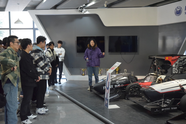 讲座开始前,同济大学汽车学院辅导员史静远老师带领参观了同济大学大学生汽车科技创新实践基地。同济大学大学生汽车科技创新实践基地是以汽车科技创新为载体,集创新实践、兴趣爱好、技能培训、创新项目一体的科技创新实践基地,在此培育出多支具有国际水平的大学生车队,并在国内外屡获大奖。通过现场讲解和宣传视频学习,同学们了解了同济大学汽车学院的发展历程,见识了汽车学院引以为傲的三支车队,欣赏了各式各样的汽车模型。这些前沿的设计作品激发了同学们极大的兴趣,期间不断有同学向老师请教问题,现场学习氛围浓厚。