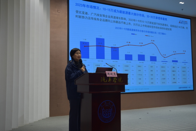 随后,同学们前往新能源工程中心二楼报告厅参加第84期“同车行”大讲堂,盖世汽车创始人、总裁周晓莺女士以“中国汽车产业的新长征”为题作报告,从汽车产业发展趋势思考、宏观市场与汽车市场展望、汽车智能化产业洞察、汽车电动化产业洞察、汽车人才发展的新坐标五个方面为大家简析汽车行业的发展趋势。盖世汽车作为行业人士了解汽车产业发展动向及信息的专业产业咨询平台,聚焦和关注全球汽车产业链的最新动态和方向,主要的用户覆盖了上下游的管理、供应链、技术研发、市场营销等各个职能,已成为汽车产业垂直领域领先的产业互联网和智库。除了专业干货满满外,周老师还向大家传授了个人发展道路思考与感悟,寄语同学们要以“终生成长”为目标,勇于尝试、敢于担当,勤于学习、善于实践,实现自我能力、认知的持续提升。