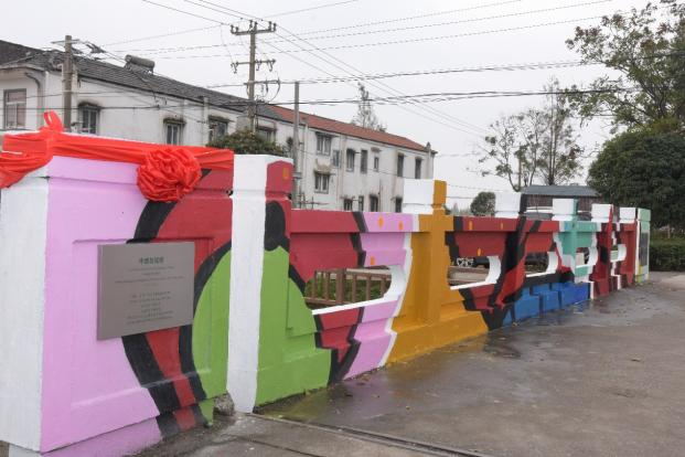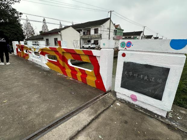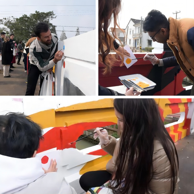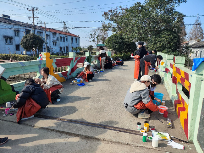 “中西友谊桥”由杨奕彤老师负责设计,并与易岚岚老师等一起带领学生在活动举办前进行了现场绘制。设计创意学院师生们冒着风雨,不畏严寒,用顽强的意志战胜了恶劣气候的影响,最终呈现给中外嘉宾们饱含热诚的作品,并希望通过“桥”的概念传递两国友谊进一步发展,这个活动同时也提升了桥绘所在地新浜镇文华村的新农村建设品质和影响力,因此也受到松江区人民政府的大力支持。