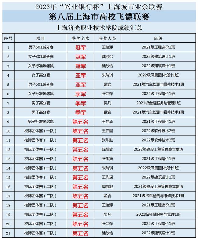 本次比赛,我校共有14名飞镖队员参赛,比赛所设置的所有7个项目的比赛均获得了较好的成绩,共获得了3个项目的冠军,21人次获奖。学校的志愿者和所有工作人员在比赛过程中展现了良好风貌,确保了本次比赛的圆满举行。本次大赛的成功举办离不开各兄弟院校的支持,随着飞镖运动的逐渐普及、选手技战术水平不断提升,上海高校飞镖联赛的赛事规模和比赛质量逐年提高。我校体育教研室将认真总结本次办赛、参赛经验,充分发挥飞镖运动在体育课程改革中的引领作用与体育文化的育人功能,争取各类赛事取得更好的成绩,进一步营造济光学院浓厚的体育文化氛围。