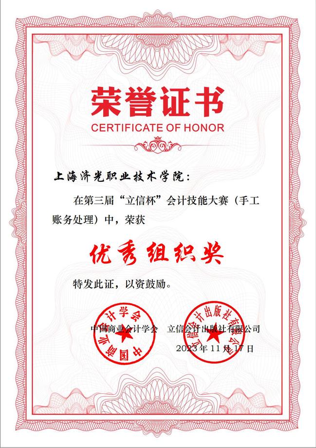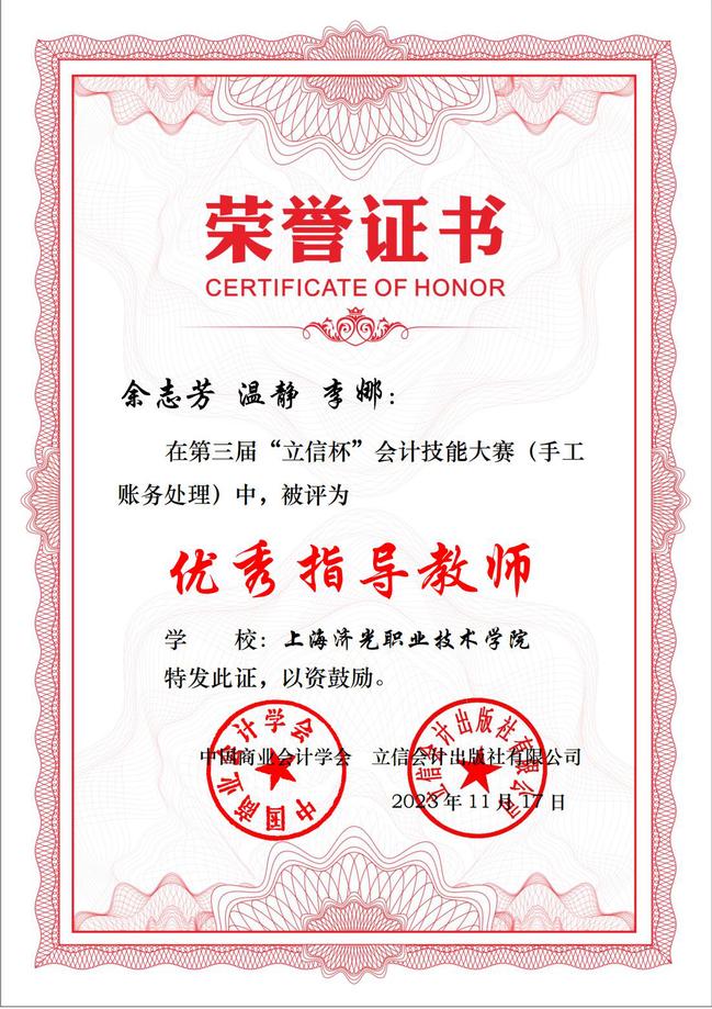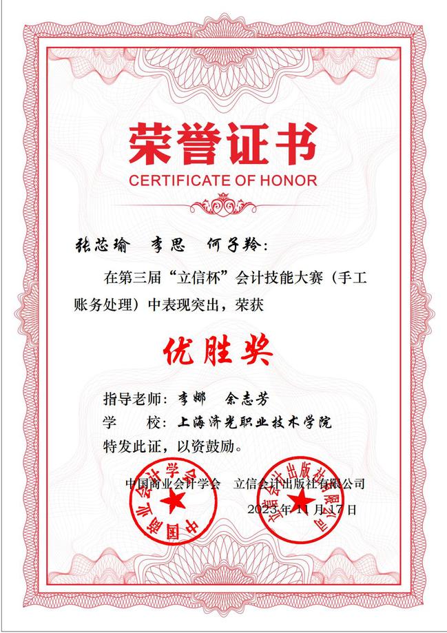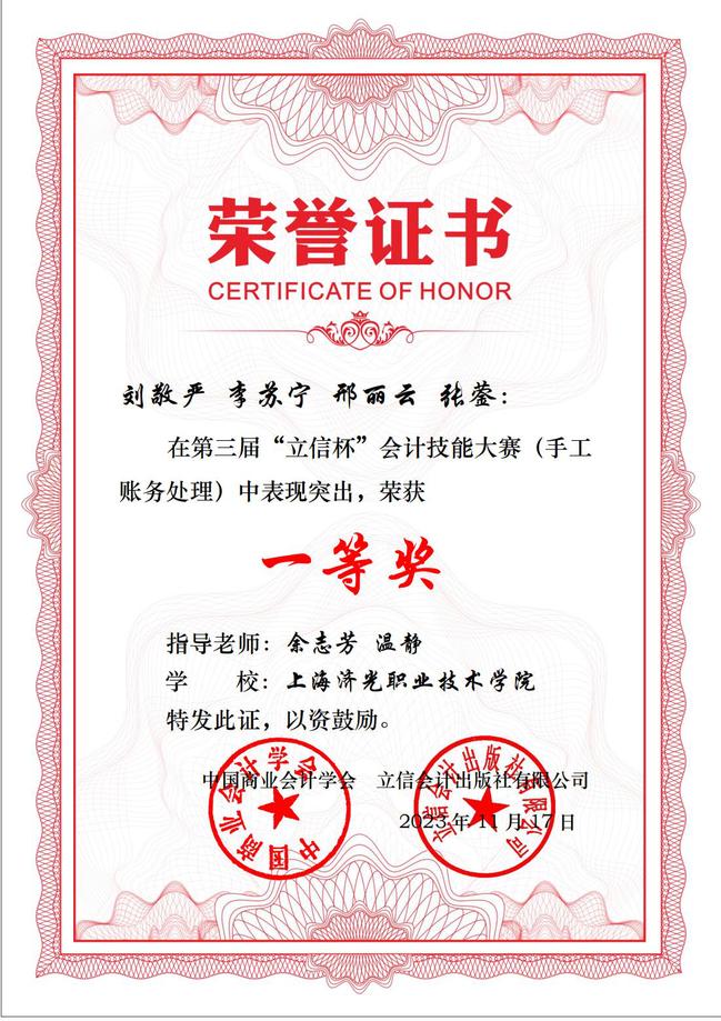 11月17日,由中国商业会计学会主办、立信会计出版社承办的第三届“立信杯”会计技能大赛(手工账务处理)在山东烟台顺利举办。第三届“立信杯”会计技能大赛(手工账务处理)共计报名院校316所,收到学生作品790组。经过大赛专家的两轮评审,我校经济管理学院大数据与会计专业22级学生刘敬严、李苏宁、邢丽云、张蓥获团体一等奖、21级学生张芯瑜、李思、何子羚获团队优胜奖,余志芳、温静、李娜老师获优秀指导教师奖,我校荣获优秀组织院校奖。