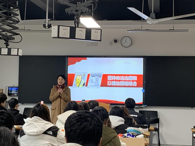袁莺副教授以《坚持依法治国和以德治国相结合》为主题,围绕“依法治国和以德治国的联系和区别”“如何共同结合推进治国理政的进程”“对于新时代的青年如何做到德法兼修”这三个问题展开,对法治和德治进行了深刻的解读。她从电视剧《西游记》中唐僧的典型特征分析进行引入,并以此阐明了中华传统文化中德法兼治的思想。随后,她从中国发展实际出发,提出法治与德治从来都是相辅相成、相互促进的。在授课过程中,她详细分析了德治和法治两者的联系和区别,通过弹幕互动和关键词分析,引导学生思考“何为良法”,并通过解读典型案例得出法治和德治是协同发力来推动依法治国进程的结论。最后,袁莺副教授进行了课堂小结并提出,要把法治教育的刚性约束、底线意识和道德教育的感化力量、精神提升紧密结合,新时代青年要争做德法兼修的时代新人。