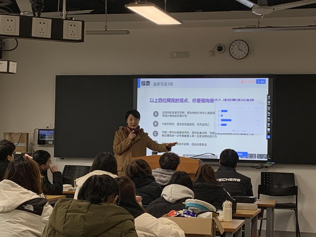 在进校授课前,袁莺老师提前针对授课班级的学生专业背景进行了学情分析,认真备课,讲课内容具有针对性、创新性,课堂上运用中华优秀传统文化经典著作提高授课的吸引力,并充分利用雨课堂弹幕、投票互动等方式调动学生参与课堂的积极性,课后她耐心回答学生问题。在授课过程中,我校学生也展示出了关心关注社会道德与法治典型事件与热点话题等的社会责任感和探索精神。