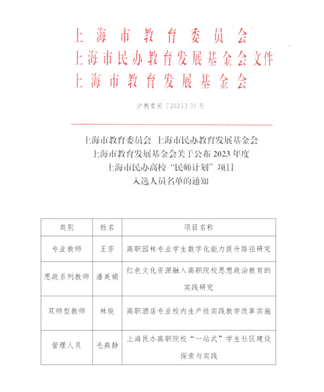 日前,由上海市教育委员会、上海市民办教育发展基金会、和上海市教育发展基金会举办的2023年上海市民办高校教师专项培育计划项目(简称“民师计划”)公布评审结果,我校人居环境与建筑设计学院王芳老师、经济管理学院林俊老师、护理学院潘美娟老师、学生处毛燕静老师成功入选。