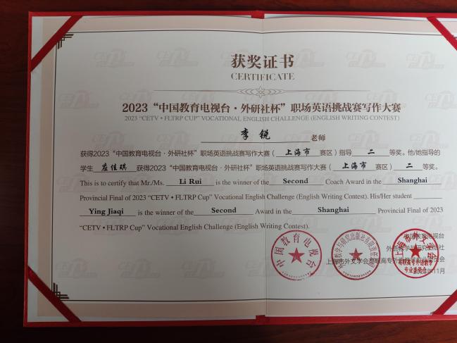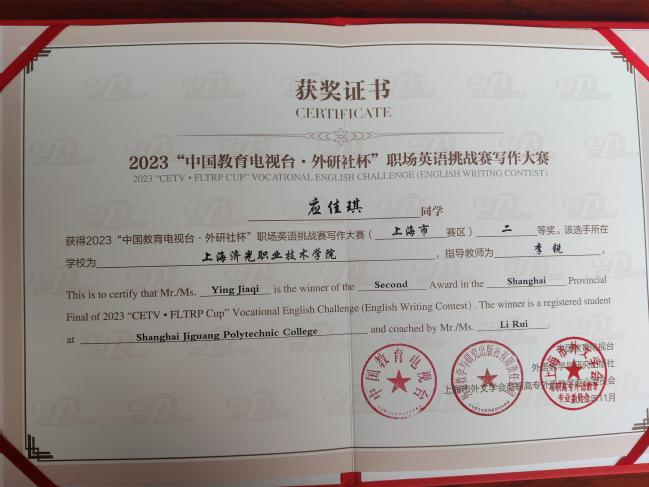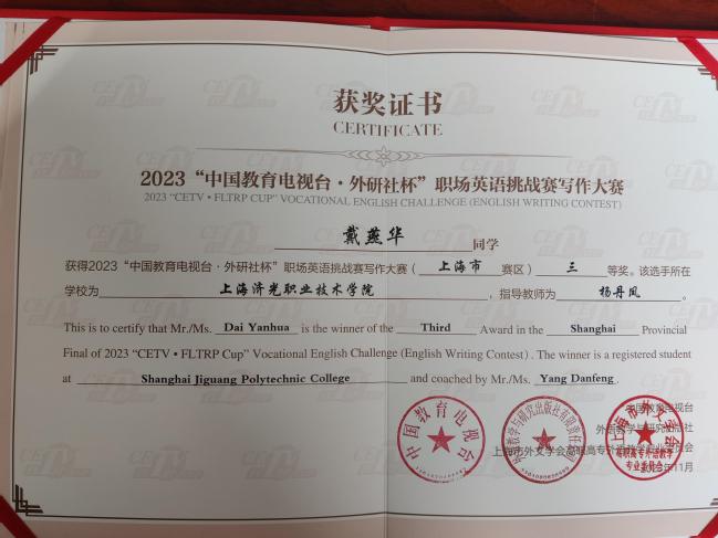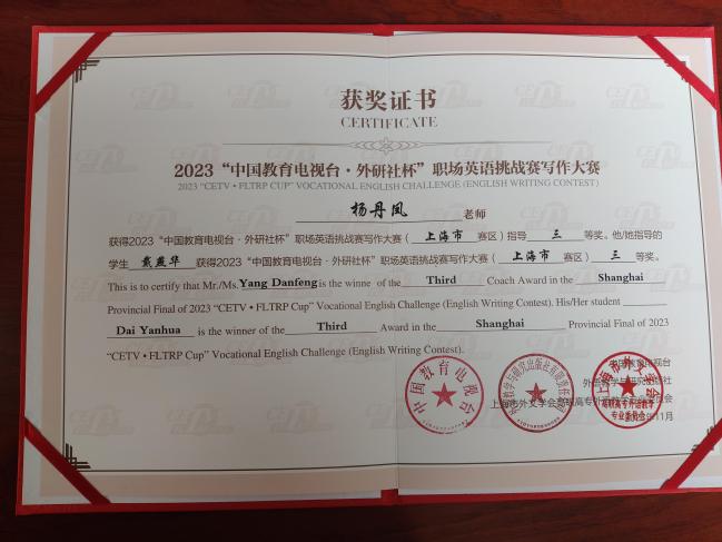 喜讯:我校学子“中国教育电视台·外研社杯”职场英语挑战赛 写作大赛上海赛区比赛中获得二、三等奖