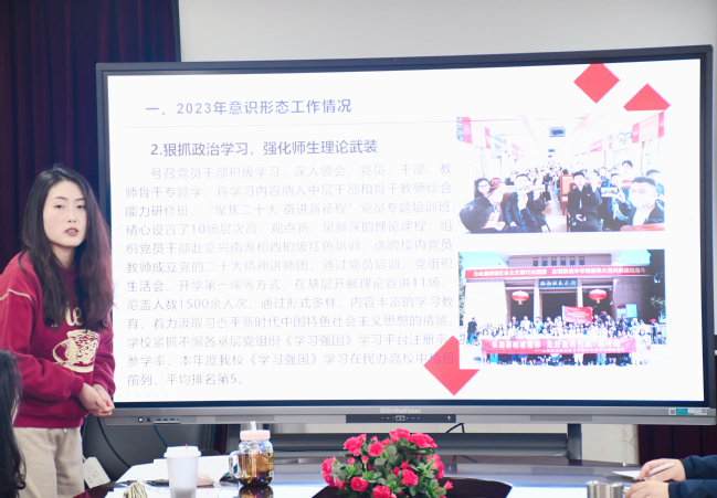 会上,宣传部副部长杜宇从意识形态工作开展情况、下一步工作计划等方面,对我校2023年意识形态工作进行汇报并对学校2024年意识形态领域重点工作进行了介绍。各二级学院汇报交流了近期学生思想动态、心理健康教育、安全隐患排查及意识形态工作开展情况。