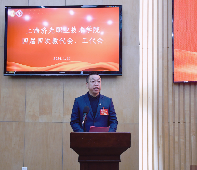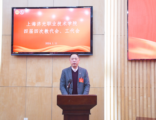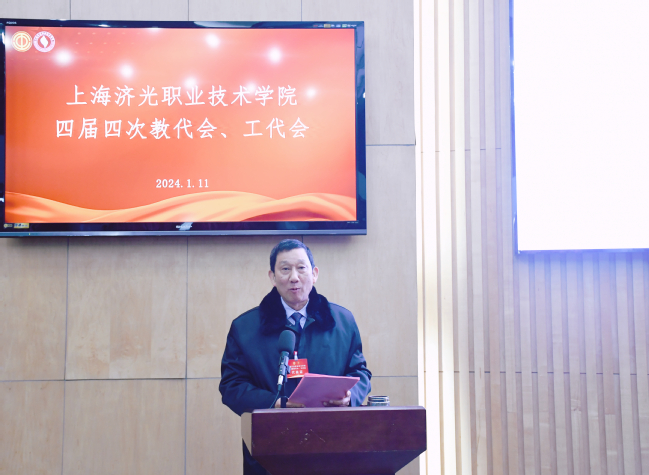 1月11日,上海济光职业技术学院四届四次教代会、工代会在圆形会议室隆重举行。75名正式代表、22名列席代表出席大会。会议由副校长、工会主席王云飞主持。