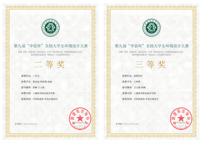 近日,由中国建筑装饰协会主办的第九届“中装杯”全国大学生环境设计大赛落下帷幕。我校由22级建筑室内设计专业同学强光晶(胡杨、单雨溪)小组和王梓彤提交的作品分别荣获二等奖和三等奖。