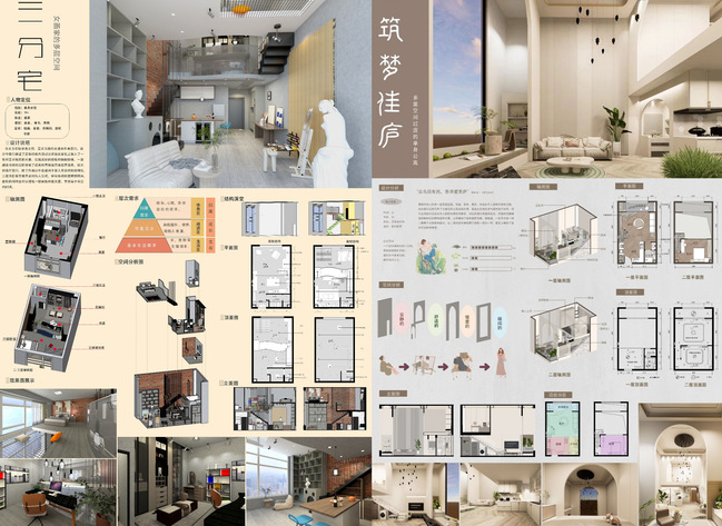 本着以赛促教的目的,建筑室内设计专业将大赛命题和课程教学进行了科学的结合,在设计教学中鼓励创新,挑战自我。为了确保出精品,首先在教学过程中进行方案初评,由各个专业带教老师推选出班级里的出色设计,再进行集中指导,深度打磨,最后共向大赛推送了十多份优秀作品。最终22级建筑室内设计2班强光晶、单雨溪、胡杨三位同学的作品“三分宅”荣获二等奖,22级建筑室内设计1班王梓彤同学的作品“筑梦佳庐”荣获三等奖。
