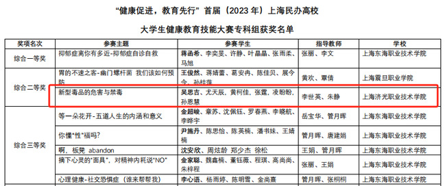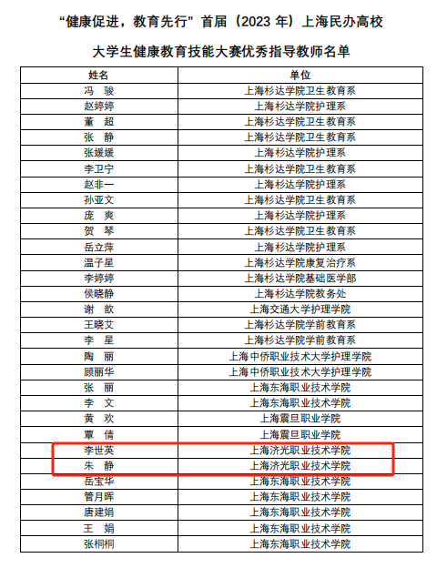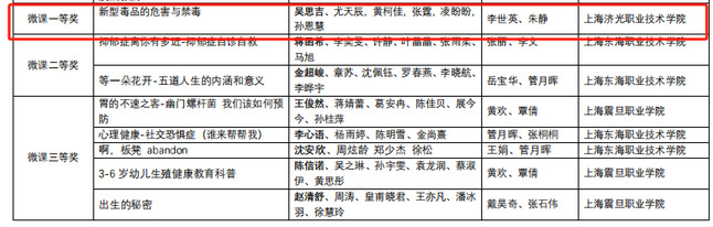 近日,“健康促进,教育先行”首届上海市民办高校大学生健康教育技能大赛成功落下帷幕。在护理学院常务副院长姚淳的带领下,学生吴思吉、张霆、凌盼盼、尤天辰、黄柯佳、孙恩慧荣获该大赛专科组“教学设计一等奖”、“微课一等奖”和“综合二等奖”。指导教师朱静和李世英荣获“优秀指导教师”称号。