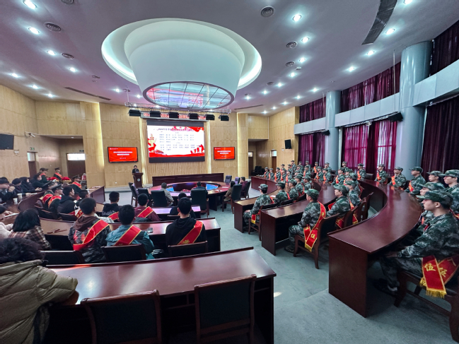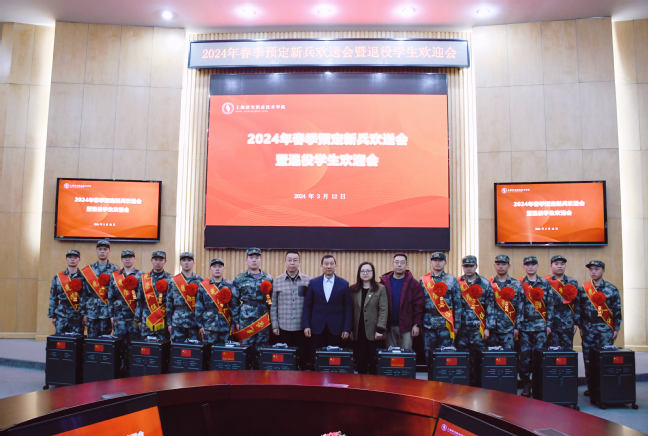 3月12日下午,2024年春季预定新兵欢送会暨退役学生欢迎会在宝山校区学生活动中心圆形会议室召开。校长胡展飞、党委副书记刘丽、副校长王云飞、副校长孙遥出席此次会议,各二级学院党总支、直属党支部书记、相关辅导员、2024年春季全体预定新兵及2024年春季退役学生代表参加此次会议。