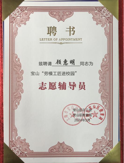 建筑工程学院顾惠明大师受聘为宝山区“劳模工匠进校园”首批“志愿辅导员”