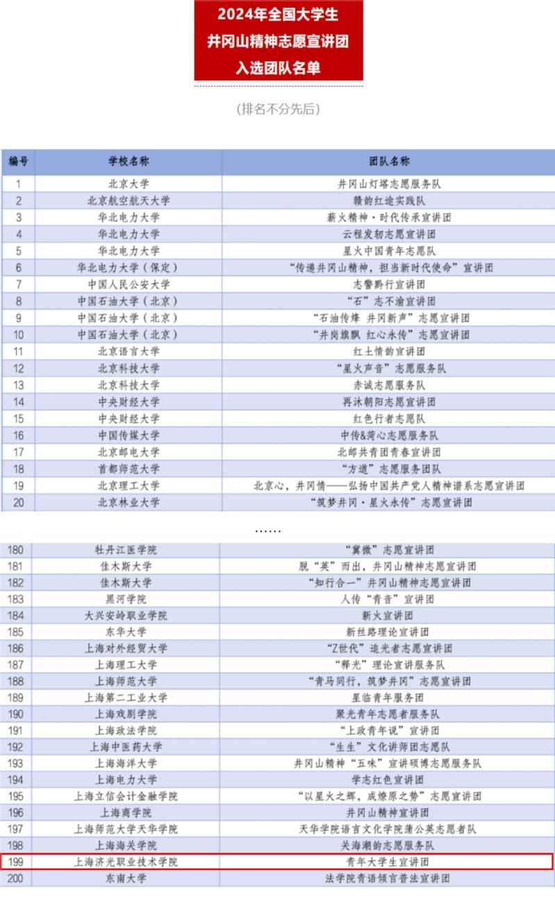 近日,为深入学习宣传贯彻习近平新时代中国特色社会主义思想和党的二十大精神,落实“强国复兴有我”群众性主题宣传教育活动相关要求,引导动员青年学生大力弘扬井冈山精神,团中央青年志愿者行动指导中心、全国青少年井冈山革命传统教育基地管理中心联合发布了《关于遴选2024年全国大学生井冈山精神志愿宣讲团的公告》,主办单位对所有材料进行了认真审阅,最终遴选出全国882所高校的1000支大学生志愿服务团队。由我校申报的“上海济光职业技术学院青年大学生宣讲团”成功入选大学生志愿服务团队。