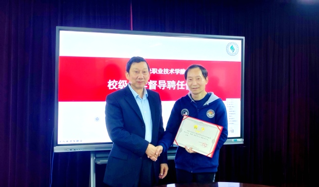 胡展飞校长对新一届校级教学督导组的成立表示祝贺和感谢,并为校外教学督导颁发聘书。他对新形势下的教学督导工作提出三点要求:一是提高站位、拓宽视野,深入领会新时代督导的新理念和新要求,教学督导工作内容从理论课堂向实验实训环节延伸,创新工作方式方法,为职业教育教学提供咨询和指导;二是督导组是学校内部质量保证体系建设的重要力量,希望督导组专家充分发挥“督”和“导”作用,在课堂教学、课程建设和专业建设等工作中贡献智慧;三是教学督导与教师之间加强沟通交流,帮助年轻教师提升教学能力,发现并推广优秀教学案例,促进教师强化质量意识、提升教学质量和水平。