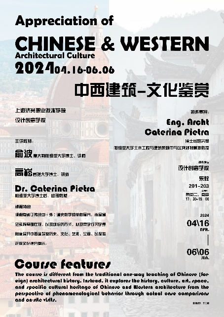 自2023年9月开始,经阴佳院长提议,赴意大利帕维亚大学攻读博士的俞波老师着手准备,2024年2月新入职设创学院的高崧老师加盟,两位教师共同精心开发新课程。旨在以通过中西建筑文化比较的方式,提升我校学生的文化自信和国际视野,促进对中西文化理解和自主学习兴趣。