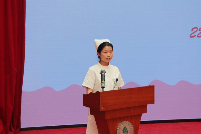 2022级护理8班徐溯代表全体学生感谢各位老师们的祝福和嘱咐,表达了对护理事业的热爱,及为之奋斗终身的决心与毅力。