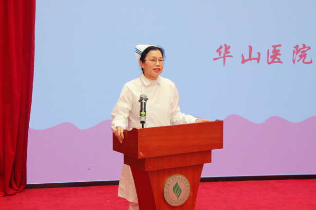 华山医院护理部副主任黄碧红寄语同学们,护理事业的未来属于你们。她祝愿每位同学都能顺利走向实习岗位,希望大家都能热爱护理事业,忠于职守,一切以患者为中心,永葆白衣天使的圣洁。