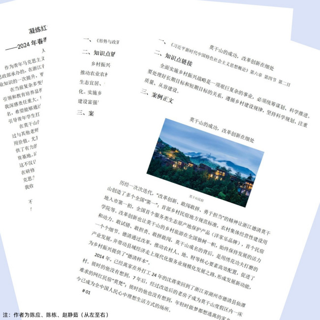 近年来,我校坚持以习近平新时代中国特色社会主义思想为指导,落实立德树人根本任务,将思政工作与学校实际相结合,创新工作方式方法,多措并举构建“大思政”工作格局,注重探索校内外一体化、知信行一体化的“大思政课”育人共同体构建,开门办思政,学在天地间。本次“看余村生态蝶变 寻莫干山红色足迹”主题研修活动,让老师们更加直观地感受到了余村在习近平总书记提出的“两山理论”的指引下,如何将绿水青山变成幸福靠山,“八八战略”如何让浙江省召唤改革“神龙”,靠吃改革饭,率先实现高水平全面小康,迈向共同富裕美好未来。研学过程中,思政部专门组织研修教师召开了现场学习讨论会,会上大家既讨论了本次研学的理论收获和实践见闻,总结探讨了我校思政课的建设现状和发展瓶颈,也重点强调了实践对于思政课教学和青年马克思主义者培养的重要性。思政课教师和“青马工程”指导教师结合此次实地考察中的收获,深入挖掘其发展逻辑与框架,将现实资源转化为思政课堂上的素材,撰写教学案例,并且编辑成册,丰富完善学校思政课教学资源库建设。通过教师实践研修积累素材,讲好中国故事,不断增强思政课的思想性、理论性和亲和力,助力“大思政课”建设。同时积累更多教学资源,提升我校思政工作铸魂育人实效性。