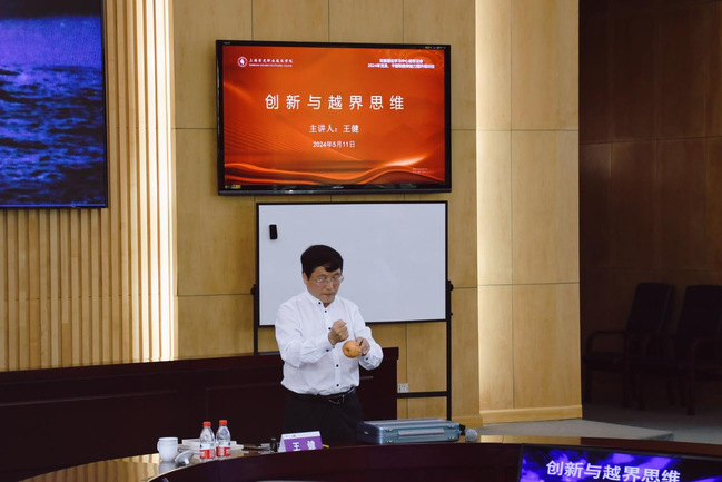 为进一步提升我校教师的创造意识和创新思维,鼓励他们在教育实践中勇于超越、敢于创新,5月11日星期六下午,同济大学王健教授应邀来校作《创新与越界思维》专题辅导报告。学校党委理论学习中心组成员、专业主任、专任教师以及2024年党员、干部和教师能力提升培训班全体学员在宝山校区圆形会议室聆听本场报告。