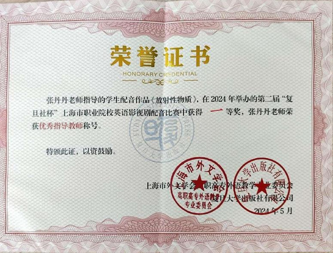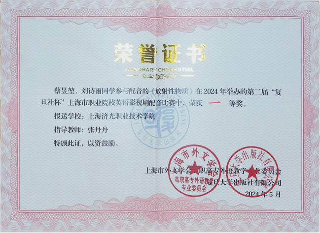 由上海市外文学会高职高专外语教学专业委员会和复旦新学术主办的第二届“复旦社杯”上海市职业院校英语影视剧配音比赛于2024年3月至5月举行。本次大赛中,全国各职业院校共报送68个参赛作品,本校22级护理专业蔡昱堃同学和23级人工智能学院软件班刘诗雨同学的配音作品《放射性物质》荣获一等奖(第3名)。
