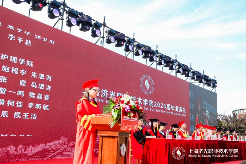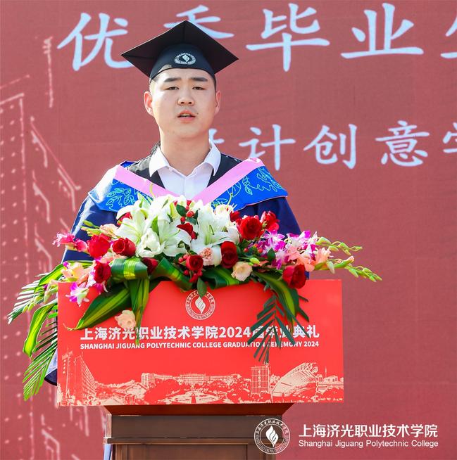 设计创意学院优秀毕业生李宗年作为毕业生代表发言,回顾了难以忘怀的大学生活,表达了对老师、同窗的感激、不舍和对母校的美好祝愿。他表示,不论济光学子身在何方,都不会忘记“求实求新、人人成才”的校训,未来要继续脚踏实地、敢挑重任、突破自我,为实现青春梦想而继续拼搏奋斗。