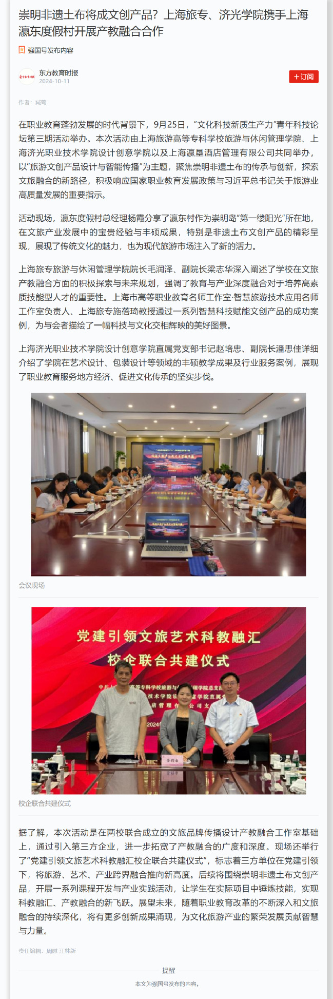 10月11日,《东方教育时报》以《崇明非遗土布将成文创产品?上海旅专、济光学院携手上海瀛东度假村开展产教融合合作》为题专题报道了我校携手上海旅专、上海瀛东度假村开展产教融合合作的丰硕成果。
