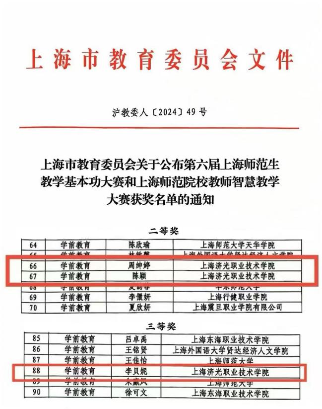 2024年10月19日,由上海市教育委员会主办的第六届上海师范生教学基本功大赛在上海师范大学徐汇校区举行。本次大赛汇聚了来自全市各大高校的优秀师范生,是上海市师范专业最高规格的竞技舞台。学前教育学院选派2022级学前教育专业周绅婷、陈颖、李贝妮三位同学参赛,经过一天的激烈角逐,最终周绅婷、陈颖荣获二等奖,李贝妮获得三等奖,展现了济光学前学子的风采。