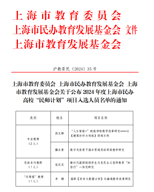 日前,由上海市教育委员会、上海市民办教育发展基金会、和上海市教育发展基金会举办的2024年上海市民办高校教师专项培育计划项目(简称“民师计划”)公布评审结果,我校人居环境与建筑设计学院段文婷、经济管理学院李娜、基础部滕永青、马克思主义学院张贝贝等4位教师成功入选。