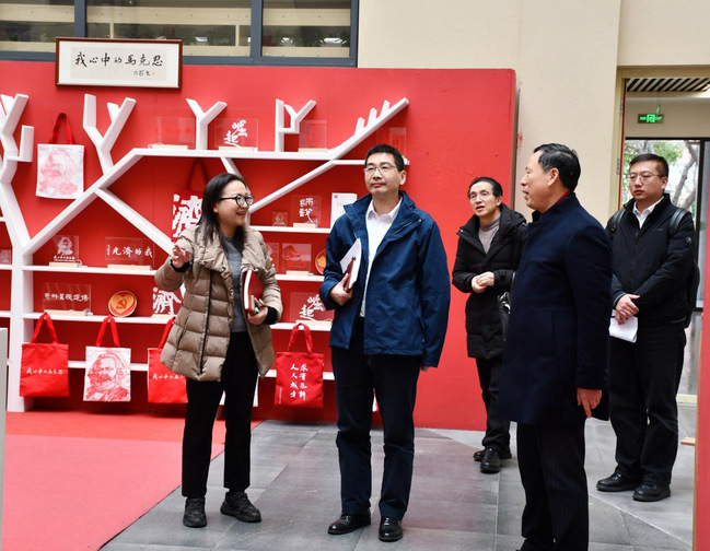 在校领导的陪同下,顾红亮副书记参观了我校图书馆“我心中的马克思”师生文创作品展、校史馆、学生活动中心“大思政课”育人场所、马克思主义学院李占才工作室等。