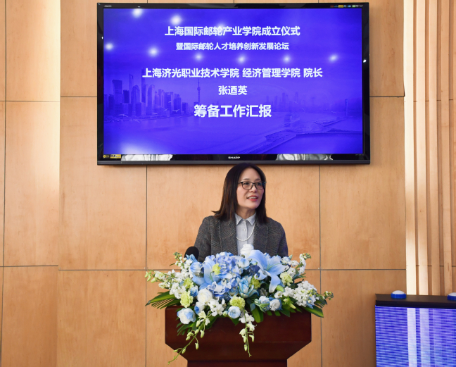 成立仪式开始前,经济管理学院院长张迺英教授向大会汇报了上海国际邮轮产业学院筹备工作情况。