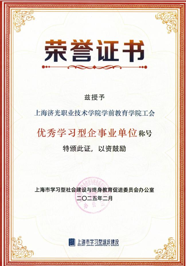 在深入学习贯彻党的二十大精神与习近平总书记关于建设学习型社会重要指示的背景下,我校工会积极响应上海市学习型社会建设号召,扎实推进学习型组织创建工作。经基层工会申报,校工会审议并推荐,上级单位多部门联合评审,学前教育学院工会于近日荣获“优秀学习型企事业单位”称号。