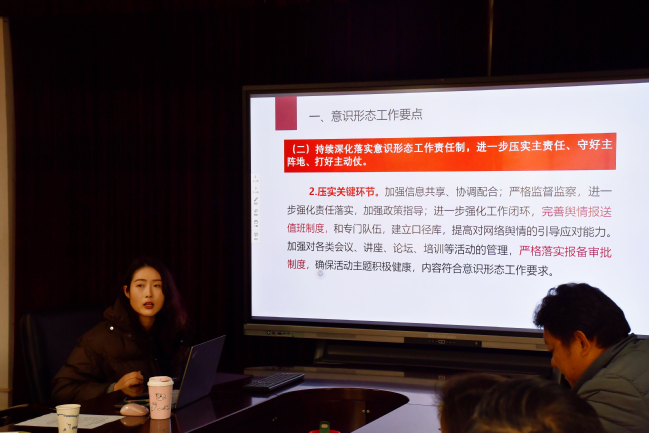 刘丽通过具体案例和相关数据,对落实落细意识形态工作责任制提出了明确要求。她指出,要深刻认识意识形态工作的极端重要性,立足本职本岗做到心中有数;要深入细致开展工作,确保风险隐患排查前置;要及时掌握师生思想动态,加强对师生的教育引导,注重风险研判前置,坚持早发现、早研判、早预警、早处置;要持续紧盯重点领域和关键环节,强化校园网络、课堂教学、学术活动、社团活动等管理力度,做好开学初学生服务管理和校园安全保障、网络舆情应对处置、师生心理健康教育等工作,确保校园意识形态安全。