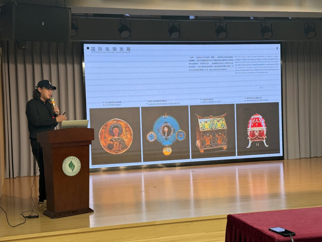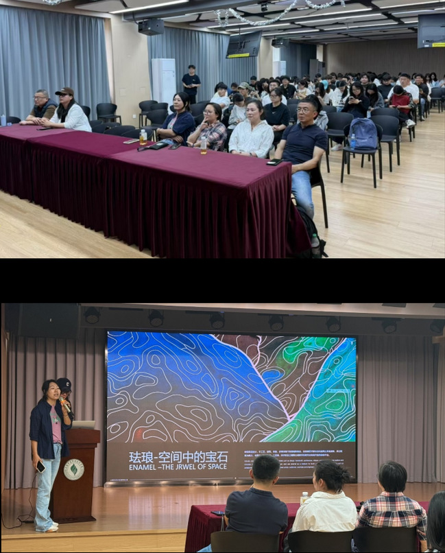 讲座中,施君从空间艺术设计视角出发,对珐琅工艺进行了深入剖析。他强调,在空间艺术创作中,珐琅的传承与发展离不开创新思维与跨界融合。施君详细分享了自己留学归国后,致力于将珐琅与当代生活、建筑空间相融合的实践经历。为让师生更直观地感受传统工艺在空间艺术中的创新应用,他介绍了自己主持的系列大型空间艺术作品。其中,位于上海中心大厦观复博物馆 480 平方米的景泰蓝地面设计荣获吉尼斯世界纪录,该作品从设计理念、色彩搭配到工艺创新,每一个细节都充分体现了传统工艺与现代空间艺术设计理念的深度融合,为空间艺术专业的设计实践提供了全新思路与宝贵经验。