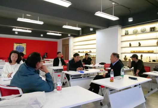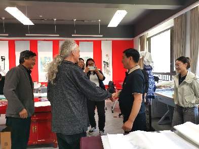 在装裱师职业能力等级评价考试的培训期间,从德国专程前来报道上海车博会的德国汽车专家托马斯·凯福也抽空参观了装裱实训室并和马主任进行了交流,他对传统技艺很感兴趣,特别谈到了三十多年前还作为柏林工大博士生时在同济大学学习汉语时的经历以及中国文化对他的深刻影响。