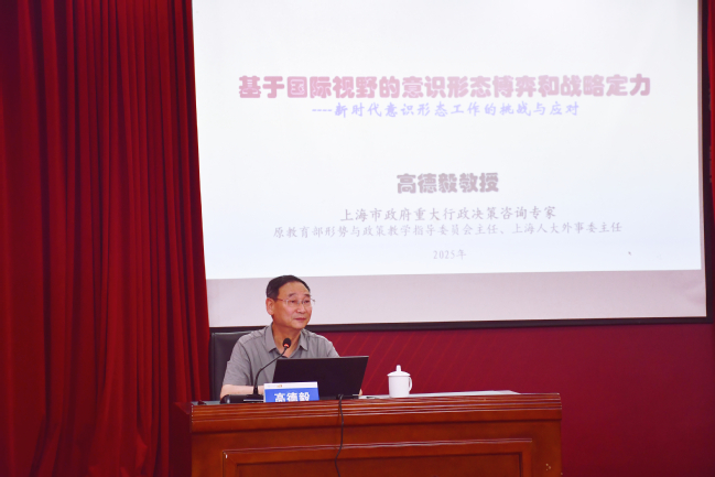 高德毅以“基于国际视野的意识形态博弈和战略定力——新时代意识形态工作的挑战与应对”为主题作辅导报告。他从意识形态的概念出发,讲述了意识形态演变与发展,深度剖析了意识形态的政治价值,精辟阐述了世界中西方意识形态博弈的现状、策略与行动。他结合当前国际国内形势,用生动详尽的资料以及自身长期的研究成果和丰富的工作经历,全面分析意识形态领域面临的风险和挑战,指明了当代中国意识形态工作的战略定力和政治责任。
