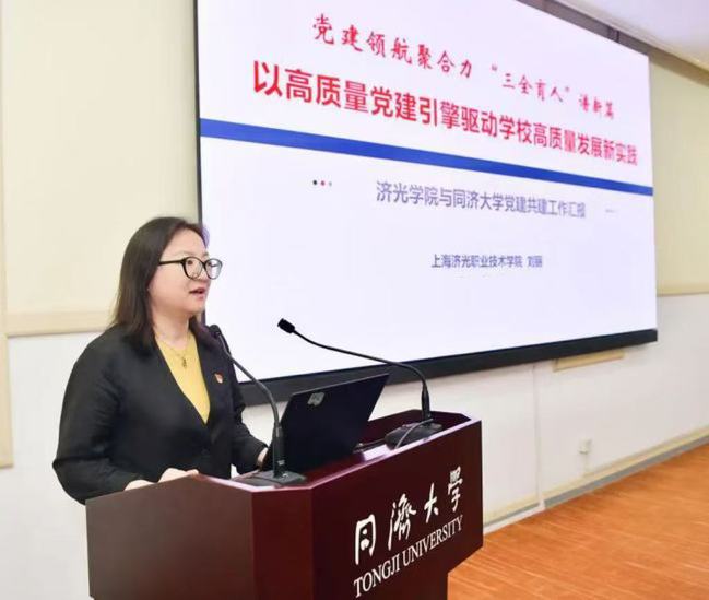 姜富明将两校党建共建历程划分为两个阶段,进行了系统回顾和总结,并充分肯定了共建以来取得的成效。他指出,在第一阶段,同济大学发挥自身优势助力济光学院规范发展,推动我校构建完善的党建与思政工作制度体系。在第二阶段,济光学院深入学习同济精神与同济经验,并将其转化为推动自身发展的内生动力,形成了具有济光特色的党建与思政工作品牌。两校共建从党建领域逐步向教学科研、人才培养等多领域延伸,合作模式也从以往的单向支持逐步转变为双向互动,实现优势互补、错位发展。姜富明对下一阶段两校党建共建工作提出新设想。他强调,济光学院将以习近平总书记关于职业教育的重要指示为指导,紧密依托同济大学的支持,高质量推进新时代立德树人工程,进一步彰显特色,取得实效。