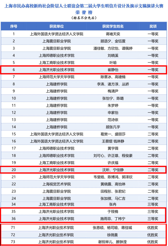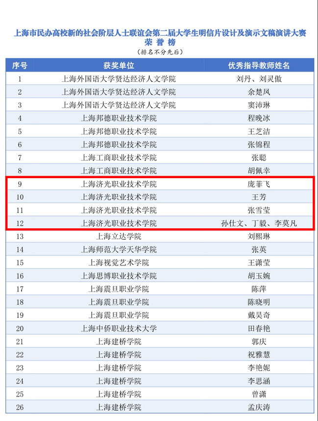 本次比赛,在校党委统战部大力支持和上海市民办高校新的社会阶层人士联谊会上海济光职业技术学院分会的精心组织下,我校共15份作品参赛,最终斩获多项荣誉:学校获“优秀组织奖”,6名教师获评“优秀指导教师”,学生作品斩获一等奖1项、二等奖1项、三等奖2项、优胜奖3项。